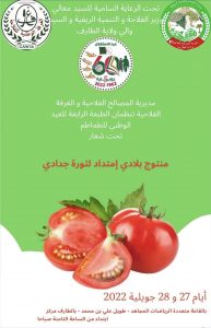 نتشرف بإبلاغكم أن النسخة الوطنية الرابعة للطماطم التي تحمل شعار “منتج بلادي امتداد لثروة أجدادي” ستقام يومي 27 و 28 جويلية 2022 في الصالة الرياضية (OMS) علي الطويل من ولاية الطارف